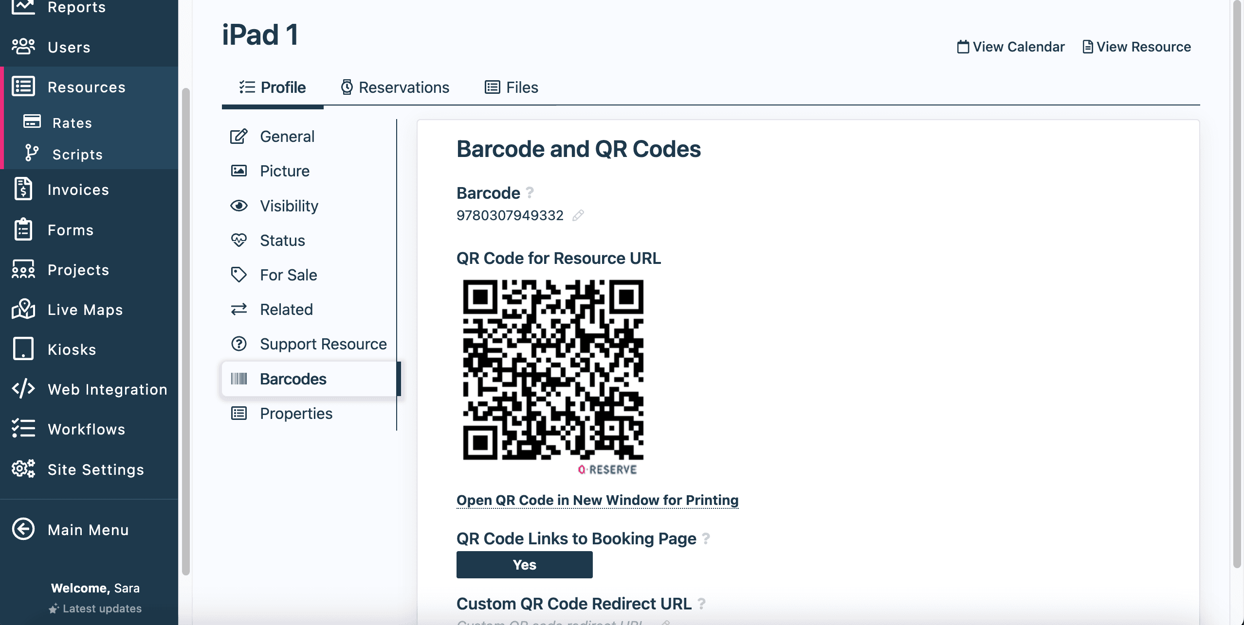 For both users and resources, you have the option of inputting your own barcodes, or using the QR codes that QReserve generates (note that the QR codes will only work with a 2D barcode scanner).